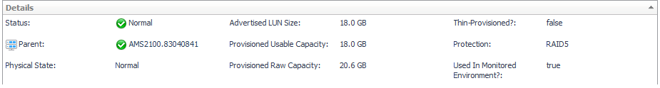 Details. Displays the LUN’s status, physical details, parent device and capacity metrics. |