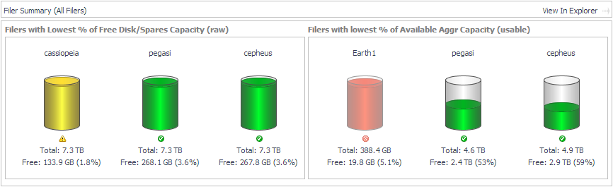 Filers with Lowest % of Available Aggr Capacity (usable). Displays cylinders showing the amount of used Aggr Capacity (Usable) Free. Below each cylinder, you can see total and free capacity.