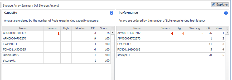 LUNs/Disks States. Plots the percentage of disks and LUNs in the storage array in problem states. Problem states are reported by the vendor. Resolving these issues may improve LUN performance.