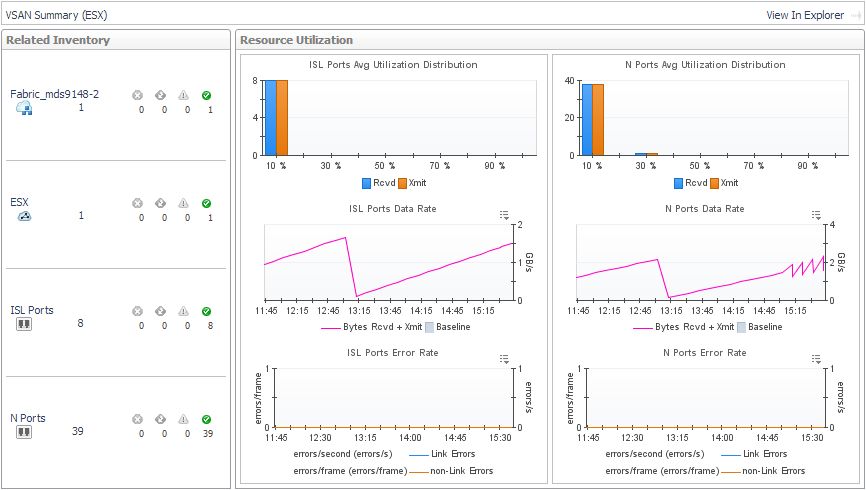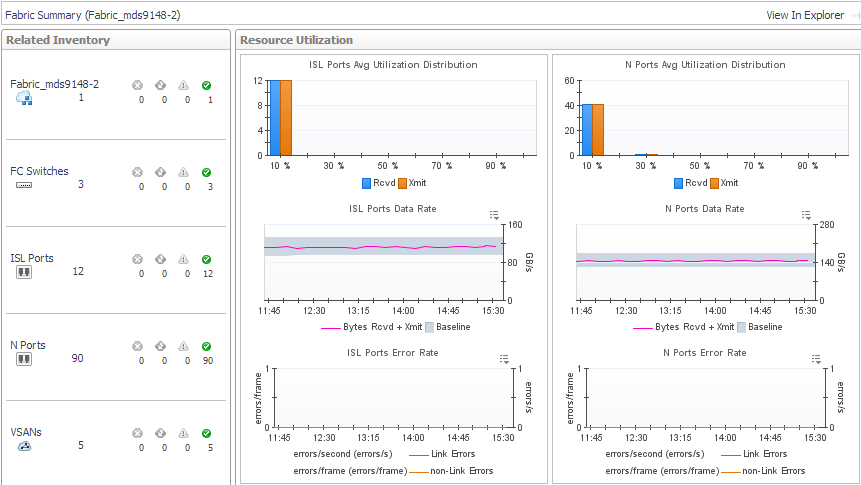 In the Fabric Summary (Selected Fabric), the Related Inventory view contains alarm summaries for the selected fabric as well as its switches, ISL ports, N ports, and VSANs (Cisco fabrics only). The Resource Utilization charts display the following metrics for ISL ports (left) and N ports (right) used by the fabric: