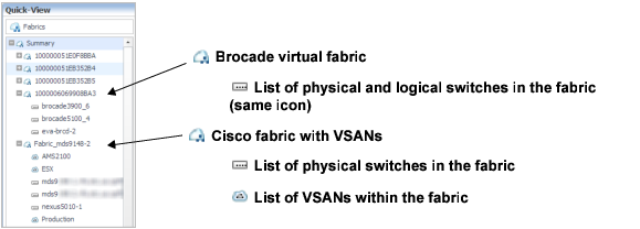 Fabrics are displayed in the Fabrics quick view of the Storage Environment dashboard. When you expand a fabric branch to view its components, the list of components varies depending on the type of fabric as follows: