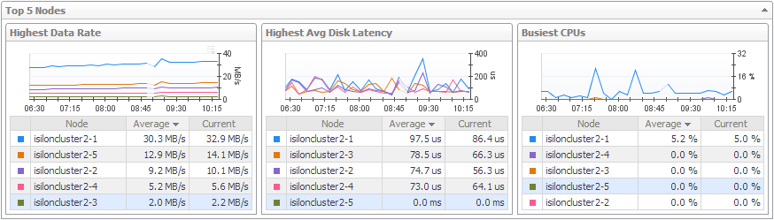 Top 5 Nodes. Displays the top five member nodes with the highest average value for Data Rate, Latency, and % Busy. The charts plot values over the time period, while the tables show the average and current values for each node.