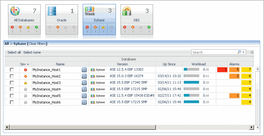 The table of database instances appearing just below the tile collection reflects the tile selection. For example, clicking the Sybase tile shows only the Sybase databases in the list.