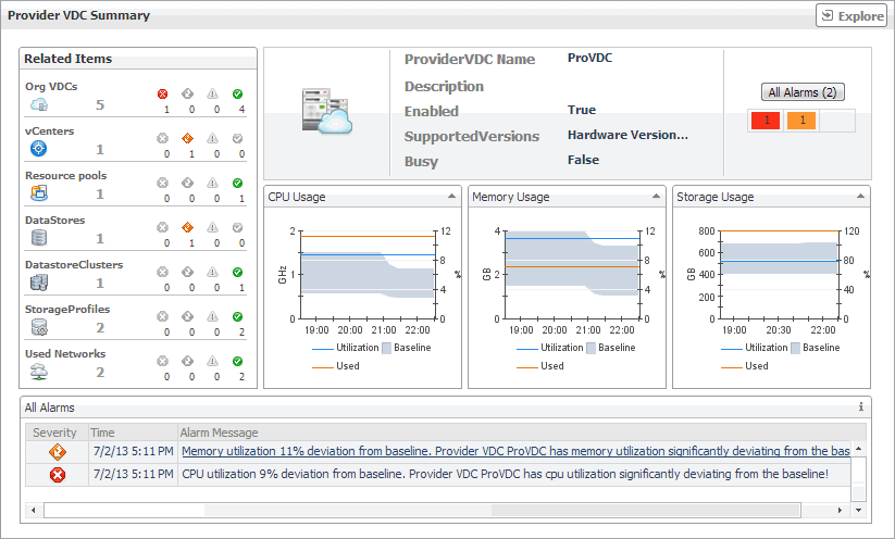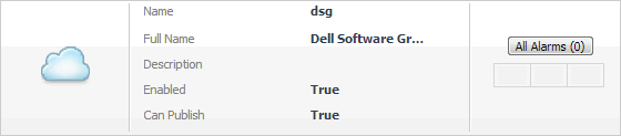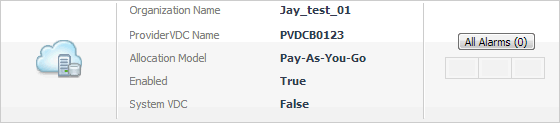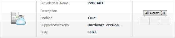 The combination of items in this view depends on the type of the selected object. For example, if you select an organization, this view displays its name, full name, description, and indicates if the view can publish or is enabled. Selecting a provider vDC shows its name, description supported versions, and indicates if the view is enabled or busy. If any alarms are generated against the selected object, the counts of alarms in each severity state are displayed.