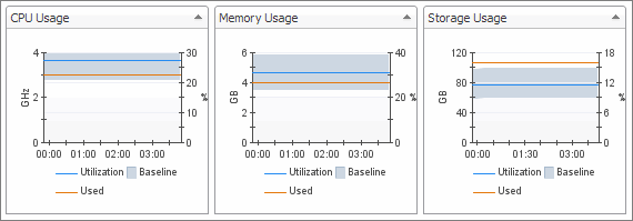 You can monitor the resource usage, allocation, and overhead of these elements when you select them in the Quick View. The information appearing in this view can help you discover potential resource-level issues such as spikes in CPU, memory and disk usage, and to reallocate resources, when required.
