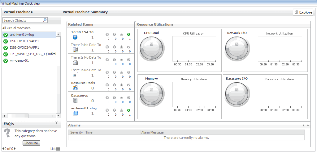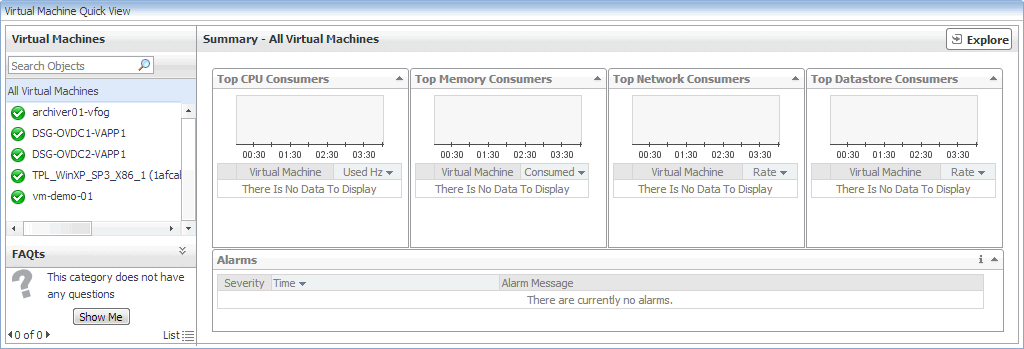 You can monitor the usage of virtual machine resources when you select one or all virtual machines in the Quick View. The information appearing in this view can help you discover potential resource-level issues such as spikes in CPU, memory and disk usage, and to reallocate resources, when required.