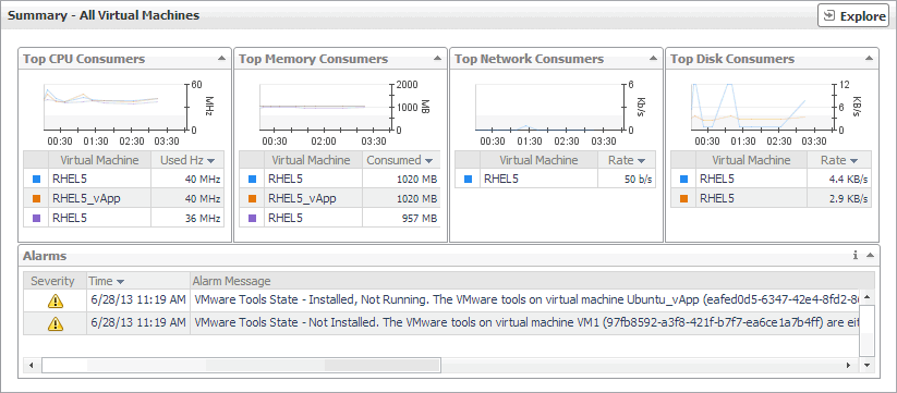 The Summary - All Virtual Machines view displays the levels of resource utilization for all virtual machines, broken down into four simple views. This view identifies the virtual machines that consume the highest amount of system resources. It can help you learn about the resource levels used by all virtual machines, and to identify and prevent potential bottlenecks by reallocating resources where they are most needed.