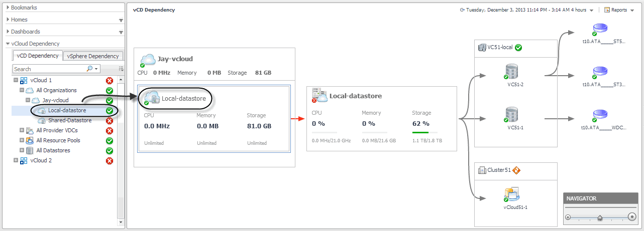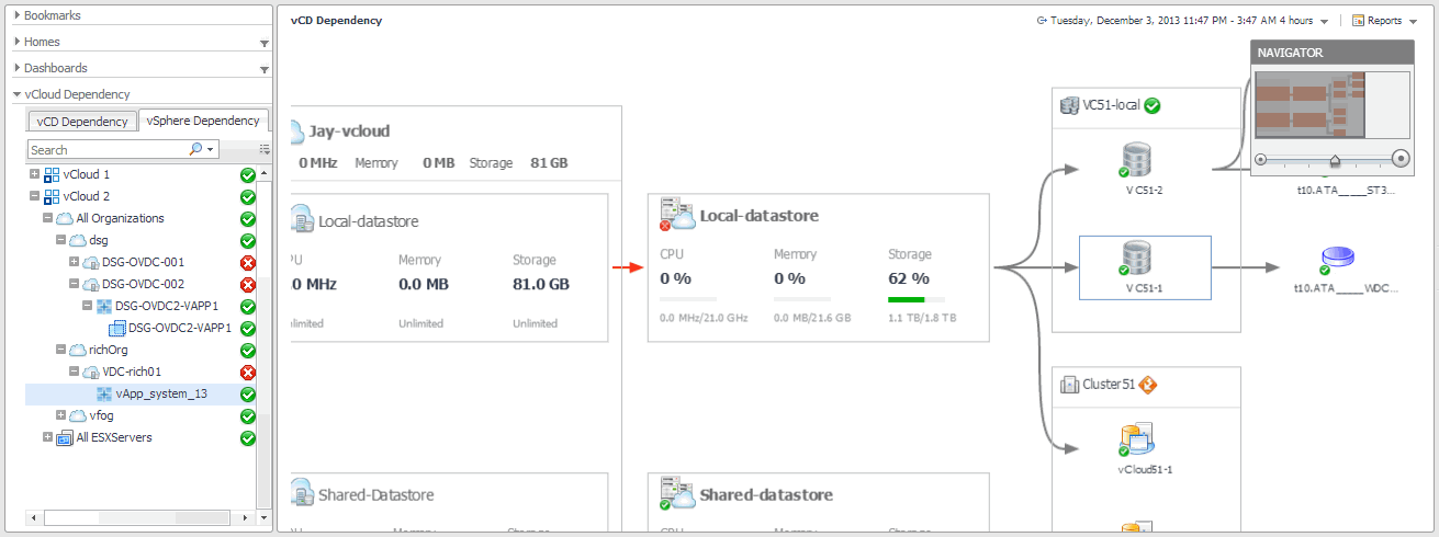 The vCloud Dependency view appearing on the navigation tab shows a navigation tree representing a simplified map of your monitored objects, and pertinent alarm information.
