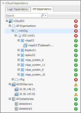 Like the vCD Dependency tab, this tab also displays the monitored vCloud Director® as the root of the navigation tree, with organizations, ESX hosts, and datastores immediately below. The tree also displays virtual machines organized into vApps. Use this view to quickly find any of these components and investigate their effect on the performance of virtual machines in your environment.