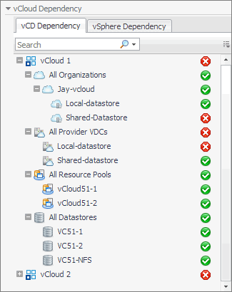 On this tab, your monitored vCloud appears as the root of the navigation tree, with all of its organizations, provider vDCs, resource pools, and datastores. Organization vDCs appear as child nodes of organizations. This structure illustrates the hierarchy of monitored objects in your vCloud Director infrastructure. Use this view to quickly locate a desired object using the logical hierarchy within your vCloud, and to explore any related dependencies.