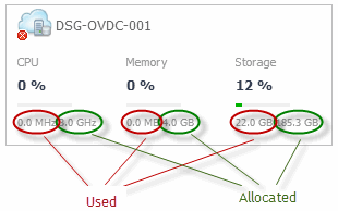 Foglight for VMware populates these tiles using the values stored as metrics collected from monitored organization vDCs.