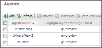 The Agents view displays information on the various agent systems that are collecting and sending details to Foglight for VMware Horizon View. This view can be used to verify that agents are properly reporting information at regular intervals to Foglight for VMware Horizon View.