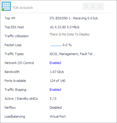On the VMware Environment dashboard, on the Monitoring tab, in the Virtual Environment Overview, select the Virtual Switches tile.