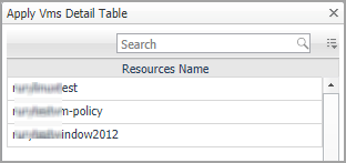 Apply Resources: Shows the selected resources by object type. Click the resources and an Apply VMs Detail Table will appear.