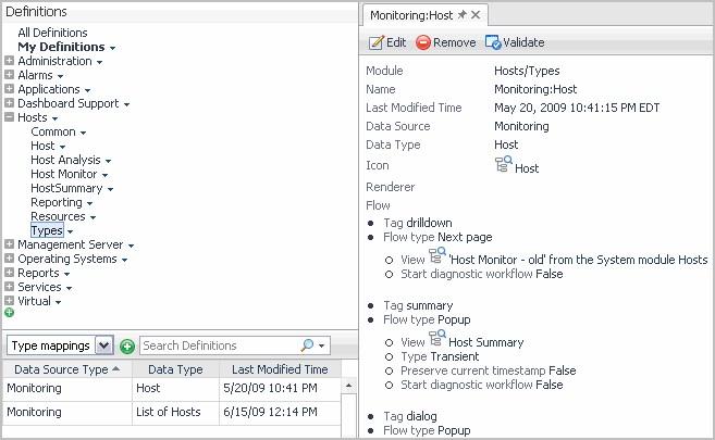 A Type Flow is defined in a Type Mapping using the Type mappings choice in the Module List drop-down. You can associate a default UI flow (via a tag) with a specific data type. For example, you can define a default flow for a Foglight Host to be a drill-down to the Host Summary page.