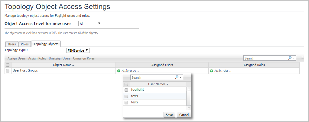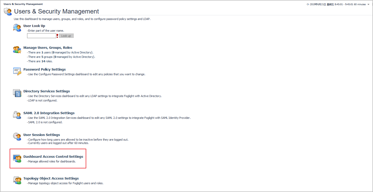 Use the User Session Settings link on the Users & Security Management dashboard to configure the period of time after which Foglight logs out inactive users. You can set it to a desired number of minutes, or to an infinite period, as required. The time-out session minimum is five minutes.