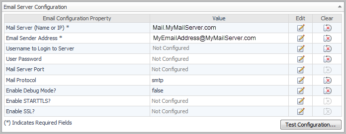 In the Email Server Configuration view, click Test Configuration. The Test Configuration dialog box opens.