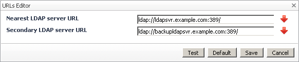 Replace the default Nearest LDAP server URL and Secondary LDAP server URL entries with the valid values, as applicable. To test the connectivity to the nearest and secondary LDAP servers, click Test. When done, save your changes by clicking Save.