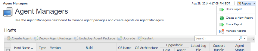 The Agent Managers and Agent Status dashboards are associated with the Hosts Report. Run this report by choosing Hosts Report from the Reports menu, and specifying the input parameters in the report wizard.