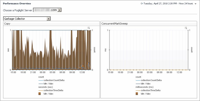 Copy: This view shows the activity of the ParNew garbage collector, used to reclaim memory in the JVM new generation part of the heap. In most cases, there is no need to be concerned with the data on this view unless the numbers become unreasonable (one hour or higher).