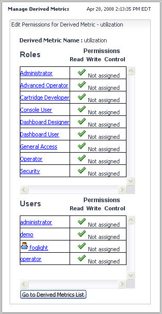 Foglight allows you to control access to derived metrics. For each derived metric you can grant or deny read, write, or control access to roles or users. For more information about security concepts in Foglight, see Managing Users and Security.