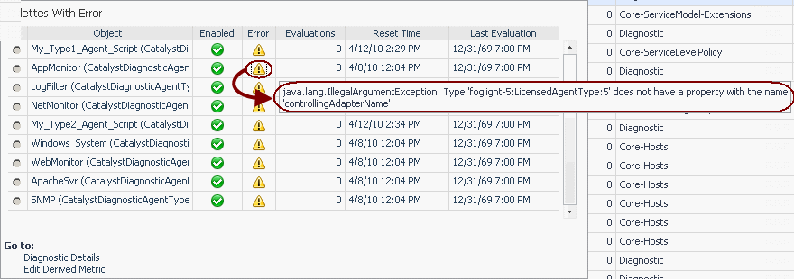 The Diagnostic Details view contains detailed run-time information about a selected derived metric. Use this view to determine which objects the derived metric is bound to and as a debugging tool to help you understand any derivation-related problems. Drill down to this view from the Derived Metrics Diagnostics dashboard.