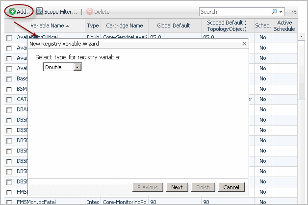 Many registry variables come included with Foglight and installed cartridges, including AvailabilityCritical, AvailabilityFatal, AvailabilityTarget, and many others. If the existing registry variables do not meet your needs, you can create a new one and add it to the registry variable collection.