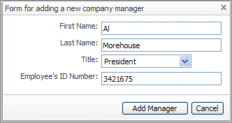 This tutorial shows you how to create a form and populate it with data. For the purpose of this tutorial, we use a Form Dialog as a form because this component contains a number of input components and as such can behave like a form. When completed, the end user fills in various input values on the form. In this tutorial, the form fields are placed in a Grid Layout, and the Grid Layout is placed in a Form Dialog container, and clicking the Form Dialog’s Submit button transmits this data to the server. The Form Dialog that we use in this tutorial is called Form for adding a new company manager. The Grid Layout that contains the input controls is called Bean Data Fields for Manager. The Grid has only a few fields, but it illustrates the general idea. A form can have any number of input fields. The dialog supplies the button that initiates the submit action.