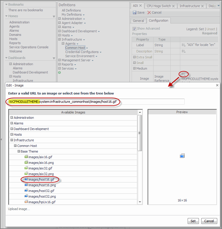 The implementation of themes relies on the existence of a base theme. The base theme contains a set of default images. When you reference a theme-specific image in a view or icon definition, you can only select a reference image from the base theme. When that view or icon appears in the browser interface, the system displays the image variant defined in the currently selected theme (such as Application or Monitoring), or the locale. This means that you only need to provide images for the themes whose images differ from the base theme images. For example, most images included with the Management Server have only the base theme and Monitoring theme variants because the Application theme is the default theme. The image variants for this theme are supplied in the base theme, which eliminates the need for a separate set of images for the Application theme.