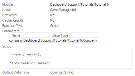 Change the way that managers are added and removed. The tutorial is presented in such a way that a manager is added to the database immediately after disposing of the dialog component. Similarly, managers are deleted by choosing Remove Manager. To allow for the changes to be reviewed, change the functions so that updating the manager list is a separate action triggered by a button on the table toolbar. The table updates as managers are added and deleted, but the changes are not be committed until the Save button is clicked.