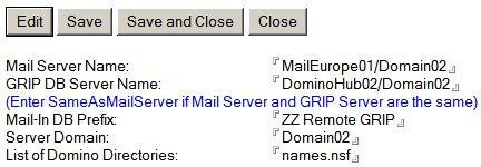 In this scenario, since each Domino Mail Server contains a Remote GRIP Database, you must define a Mail-In Database for each Domino Mail Server, as follows: