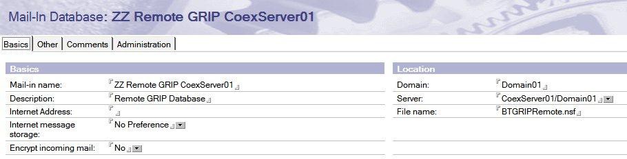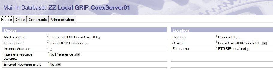 The Local GRIP Database functions as a conduit between BTCal and the Remote GRIP Database(s) using Notes mail as the transport. Therefore, each GRIP database (both Local and Remote) must be defined as a Mail-In Database in the Domino Directory.