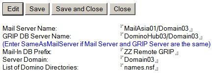 This field contains the prefix of the Mail-In Database associated with this Settings document. (Each GRIP Database in your GRIP subsystem must have an associated Mail-In Database. We will discuss this later.) The prefix will be concatenated with the common name of the Domino Server to provide the full name of the Mail-In Database. Although the prefix for each GRIP database may be different from one another, it is recommended to use the same value for all and simply distinguish the Mail-In Database names by the common name of the Domino Server (shown later in the document). It is further recommended that the Mail-In DB Prefix for the Local Settings document be “ZZ Local GRIP”, and the Mail-In DB Prefix for all other Settings documents be “ZZ Remote GRIP”.