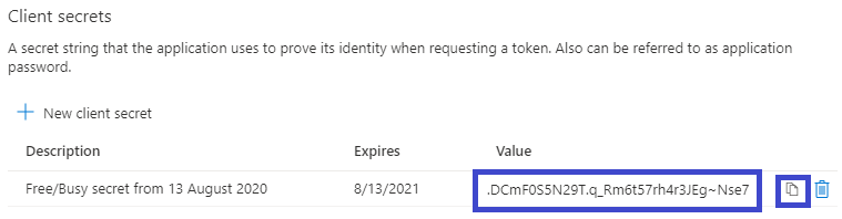 Now you have the third item, the client secret. Click the copy icon and save the client secret wherever you saved the application ID and directory ID: