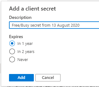 If the option to use 'Never' is used, then the secret will not expire. If either of the other options are chosen, then FreeBusy will stop working once the expiration time is reached and a new secret will need to be created and entered in Set FB Cred.