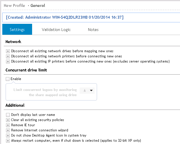 Tell Desktop Authority what drive letter you are mapping to the user’s share. Do this by selecting the Limit concurrent logons by monitoring the share mapped using drive check box on the General object.