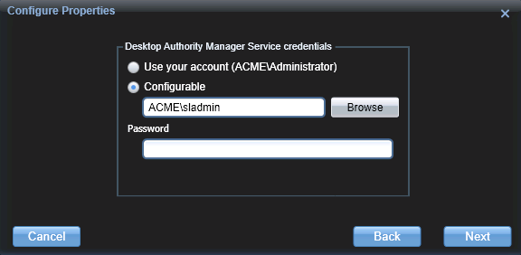 Here you can configure the credentials for the Desktop Authority Manager service.The Manager service is used to manage the Web based Console, replication, and connectivity and communication between the Console and the database. It requires a user account that is a local administrator of the Operations Master server and any other servers that will run Desktop Authority services. This service account is also used when browsing out to Active Directory objects, files and folders and for GPO deployment unless the system preference option, 'Use current user rights for browsing resources' is selected.