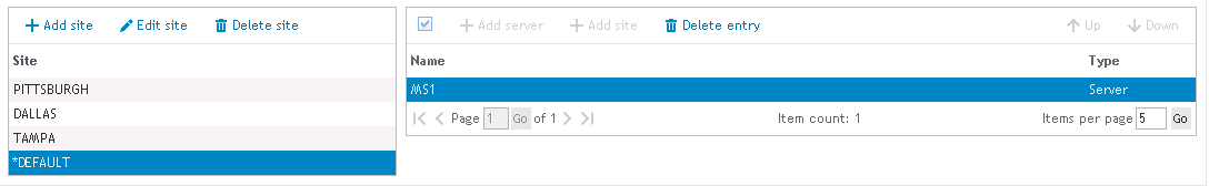 When modifying the Site list (Add or Edit site mode), the Server/Site list will be available for modification. This is where the entries for the selected Site will be added.