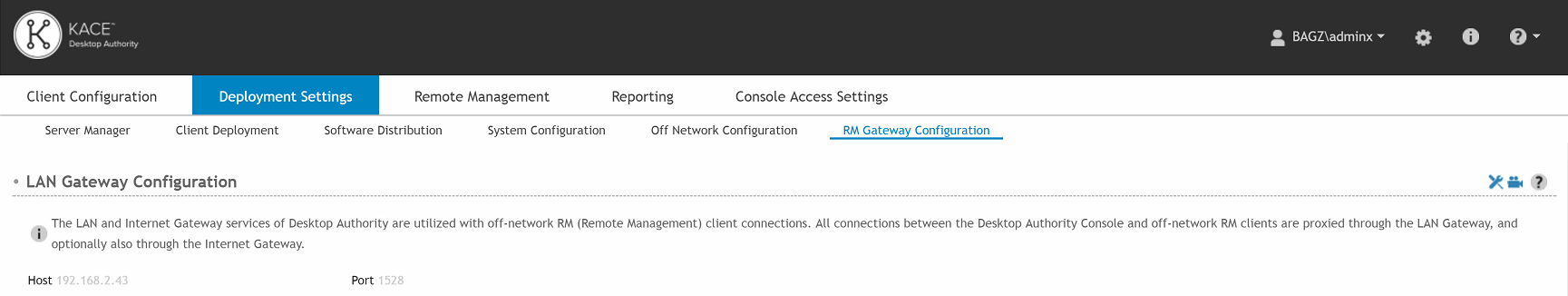 The RM Gateway Configuration tab will only be visible in the Desktop Authority (DA) console if the Off-Network Remote Management feature was either enabled during the installation of Desktop Authority, or post-installation via the Desktop Authority Setup Tool.