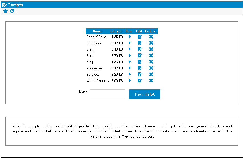 ExpertAssist comes shipped with a set of scripts that allow you to perform some typical administrative tasks on the remote computer. You may use them as a basis for your custom scripts, or you may create your own scripts from scratch as well.