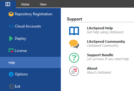 Display the LiteSpeedSupport information. Displays the LiteSpeed Help, LiteSpeed Community, Support Bundle, and About information. The File ribbon defaults to the Help selection.