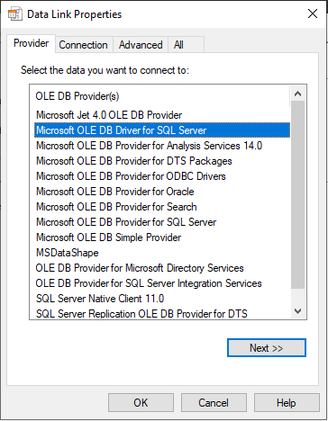 Select Microsoft OLE DB Driver for SQL Server as the type data to which you are connecting.