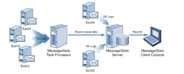 In this type of deployment, data from the remote Exchange servers is processed by the local task processor. Then the report-ready data is transferred to the MessageStats Server and stored in the database. This minimizes network traffic by eliminating the need to copy all the data from the remote servers.