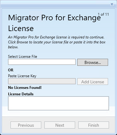 Click Browse to locate your license file (*.lic) or copy and paste the license key and click Add License. Then click Next. Migrator Pro for Exchange then validates the license file and displays the license details. Click Next.