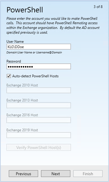 Leave the Auto-detect PowerShell Hosts checkbox marked if you want Migrator Pro for Exchange to automatically find and specify the PowerShell hosts, or unmark the checkbox if you want to manually specify the hosts in the respective text boxes: Exchange 2010 Host, Exchange 2013 Host and Exchange 2016 Host.