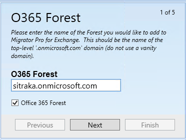 Enter the name of the Source Forest (top-level domain) you want to add to Migrator Pro for Exchange, and be sure to leave the Office 365 Forest checkbox unmarked.