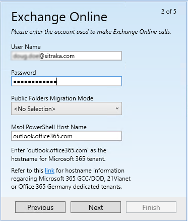Enter the User Name and Password for the account Migrator Pro for Exchange should use for PowerShell calls. This account should have PowerShell Remoting access with the Exchange organization.