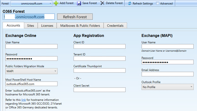NOTE: If you are migrating to Microsoft 365 and configured the local/on-premises forest during your initial Migrator Pro for Exchange Forest configuration, you can configure the M365 forest now, and Migrator Pro for Exchange will automatically switch the two. That is, Migrator Pro for Exchange will correctly configure the on-premises forest as the source and the M365 forest as the target. In that case, mark the Office 365 Forest checkbox and see Adding a New Microsoft 365 Forest.