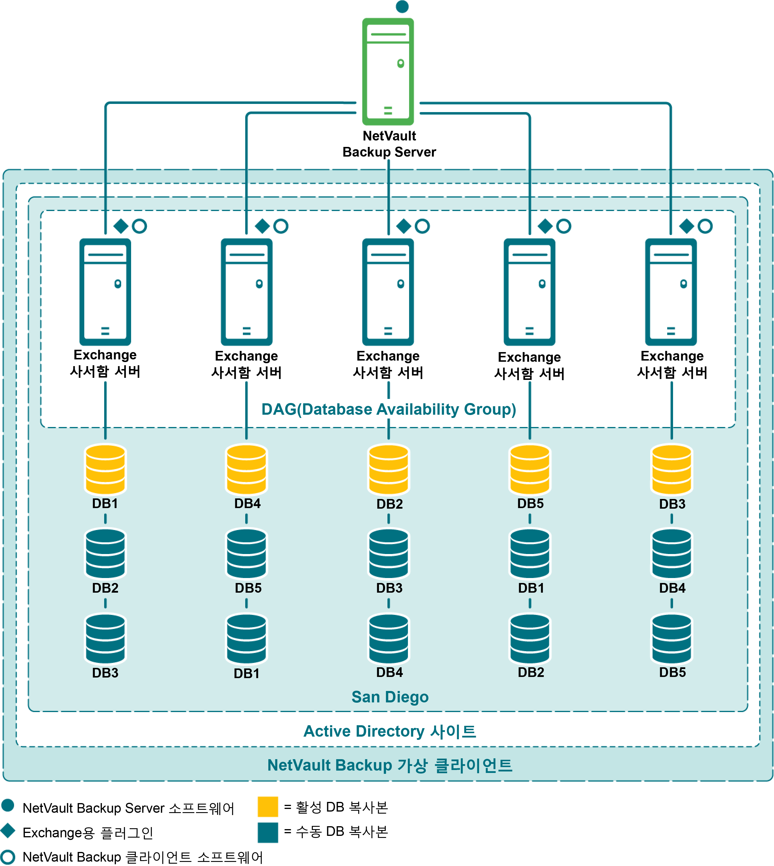 Exchange 단일 위치 DAG에서는 여러 Exchange 사서함 서버가 단일 Active Directory 사이트에 있으며 물리적으로 동일한 데이터 센터에 위치합니다. DAG는 여러 사서함 서버에 걸쳐 생성되며 데이터베이스 복사본은 여러 사서함 서버에 걸쳐 분산됩니다. 단일 위치 DAG에서는 Exchange용 플러그인이 Exchange 사서함 서버 각각에 설치되는 NetVault Backup 가상 클라이언트를 생성합니다.