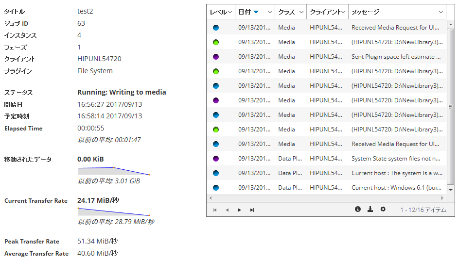 ジョブ詳細:このエリアには、ジョブ・タイトル、ジョブID、インスタンスID、フェーズ番号、クライアント名、プラグイン名、ステータス、開始時間、予測完了時間、経過時間、移動されたデータのサイズおよびデータ転送チャート、現在の転送率およびデータ転送チャート、最大転送速度、平均転送速度のような詳細が表示されます。フィールド:NDMPのプラグインを使用してジョブを実行すると、デバイス待ち、経過転送時間、推定転送残量、推定残り時間などのフィールドが表示されます。フィールド:SnapMirror to Tapeのプラグインを使用してジョブを実行すると、デバイス待ちおよび経過転送時間も表示されます。ただし、NDMPのプラグインおよびSnapMirror to Tapeのプラグインを使用してジョブを実行すると、[予測完了時間]フィールドは表示されません。